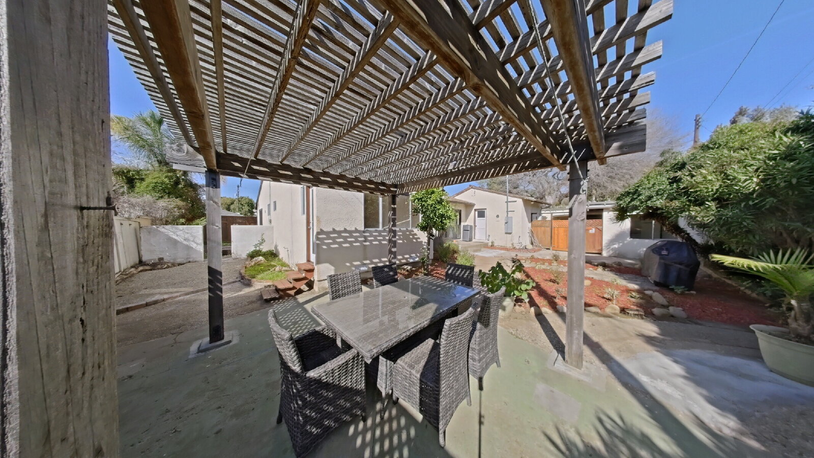 - Large private backyard with pergola and patio seating